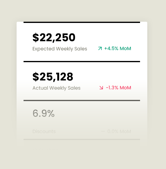 Revenue/Sales, Avg Weekly Sales (AWS), Average Ticket, Units Sold, Visits/Transactions, COGS % / Food Cost %, Labor %, Prime Cost %, Gross Margin %, Operating Profit %QUICK INSIGHTS
